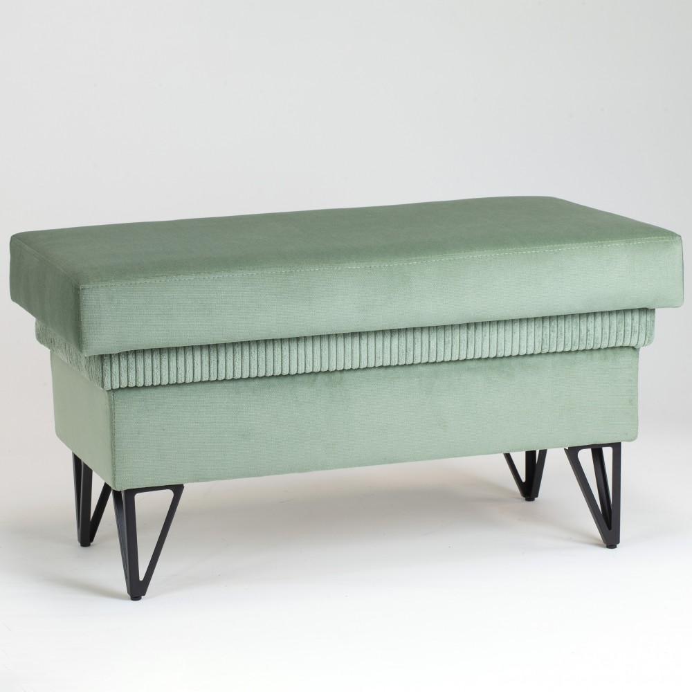 Ozdobny pas z prążkowanej tkaniny dodaje jej wyjątkowego charakteru, podkreślając jej designerski wygląd. Stabilna konstrukcja oparta na czarnych, metalowych nogach zapewnia trwałość i wytrzymałość. Dodatkowym atutem jest funkcja przechowywania – otwierane siedzisko skrywa pojemny schowek, w którym można wygodnie przechowywać koce, poduszki czy inne domowe akcesoria.
